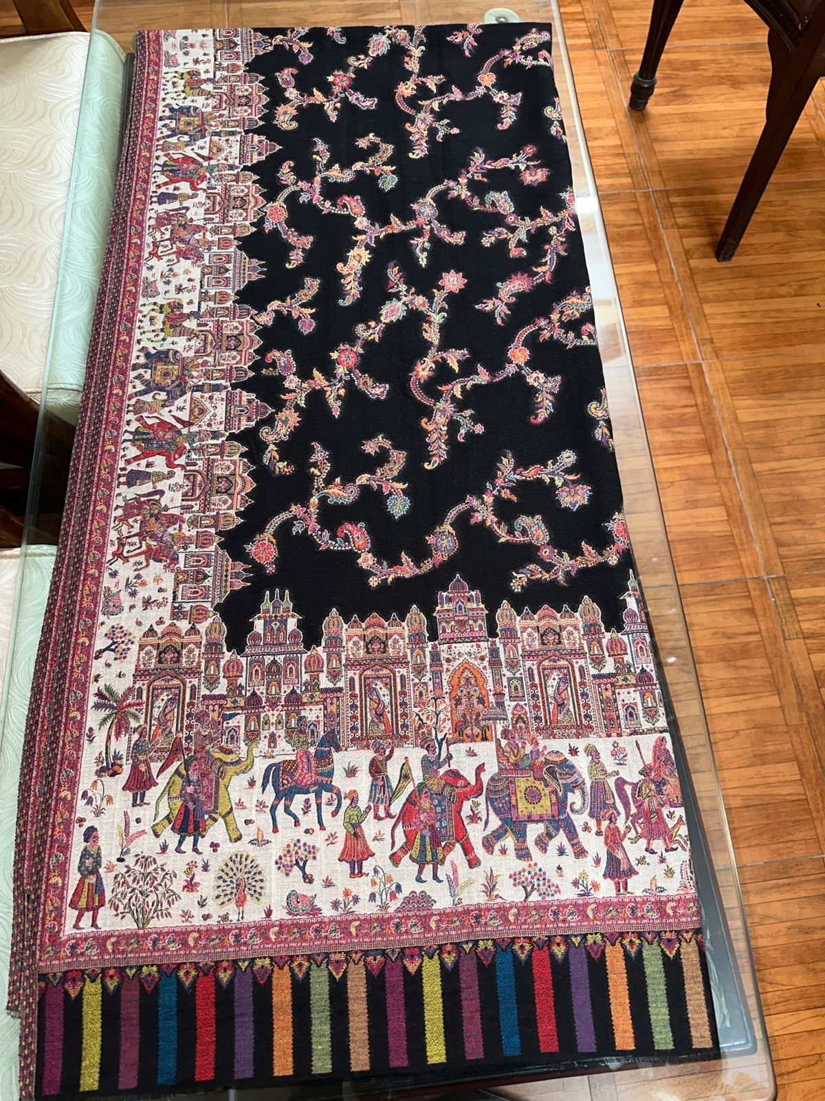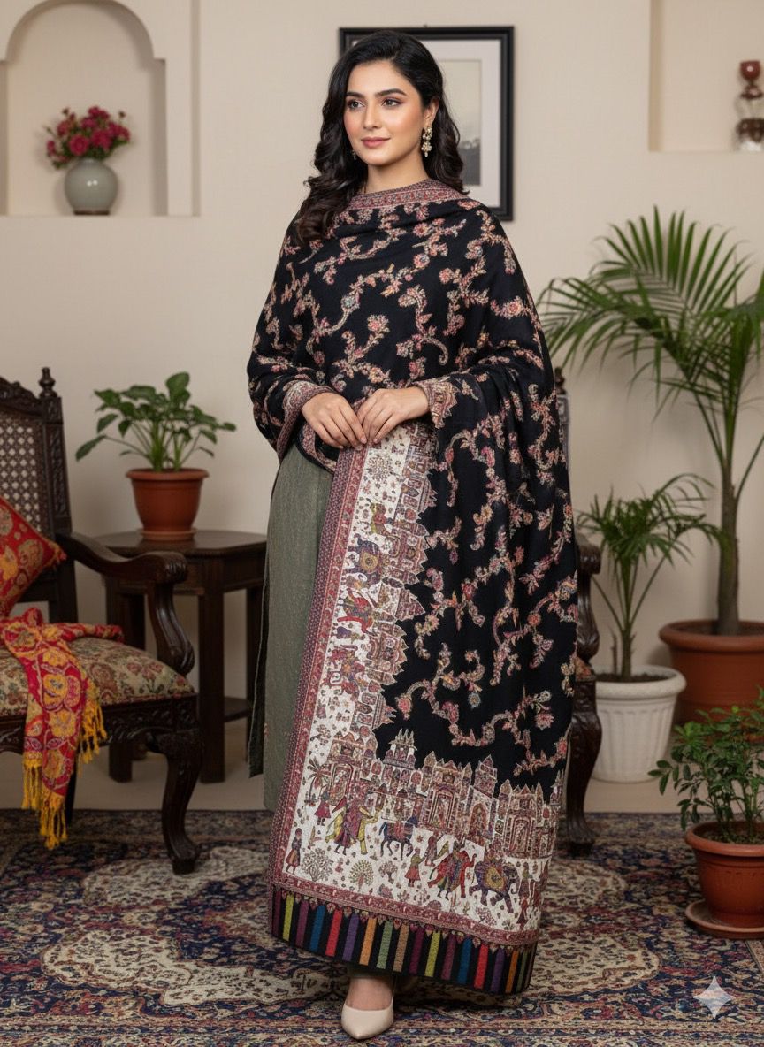 The shawl is rendered in a deep, sophisticated black colour, providing a powerful canvas that accentuates the detailed workmanship. Black lends the garment a timeless elegance, ensuring it is perfectly suited for formal evening wear, diplomatic occasions, or as a statement piece of unparalleled luxury.