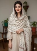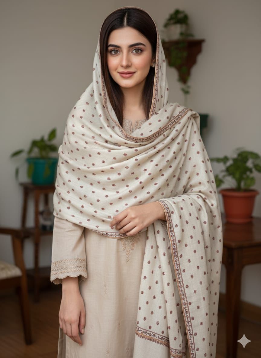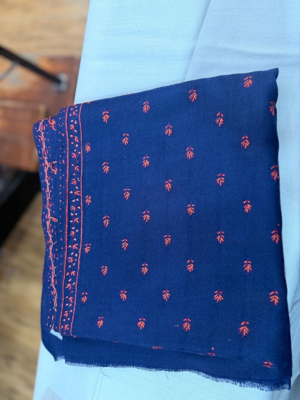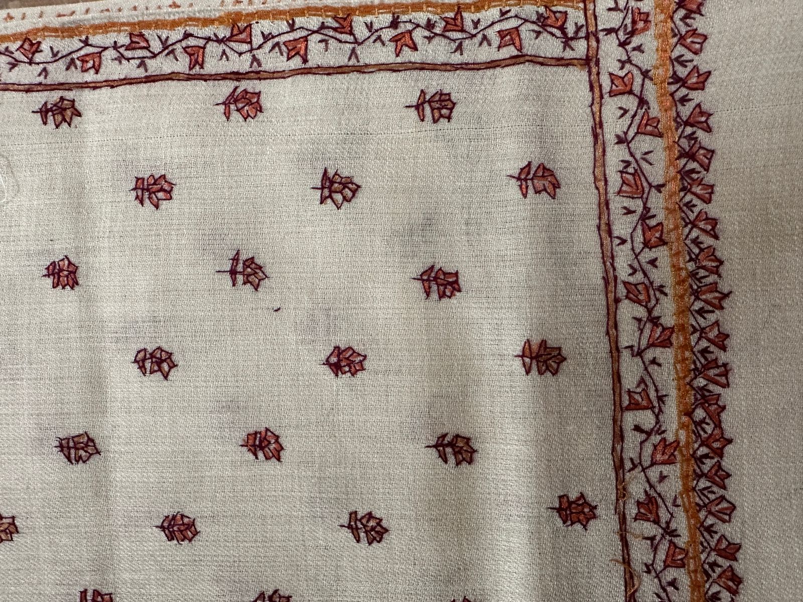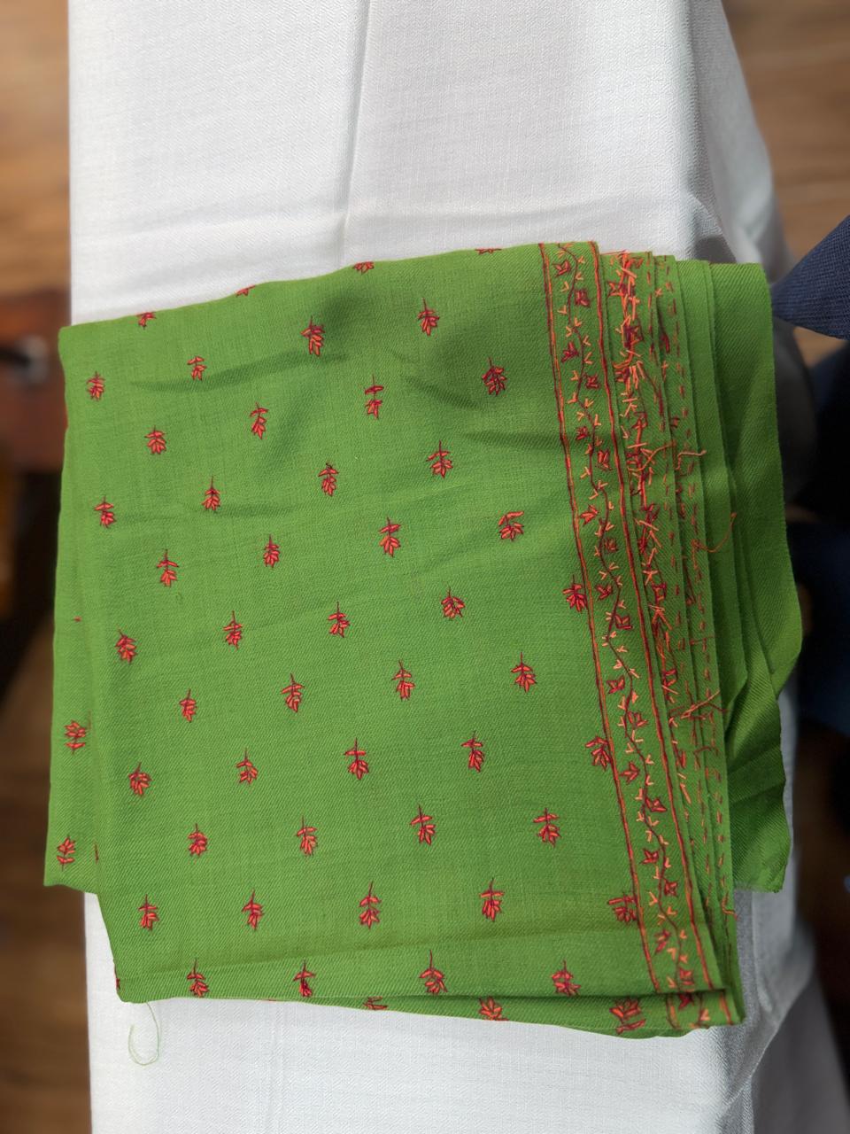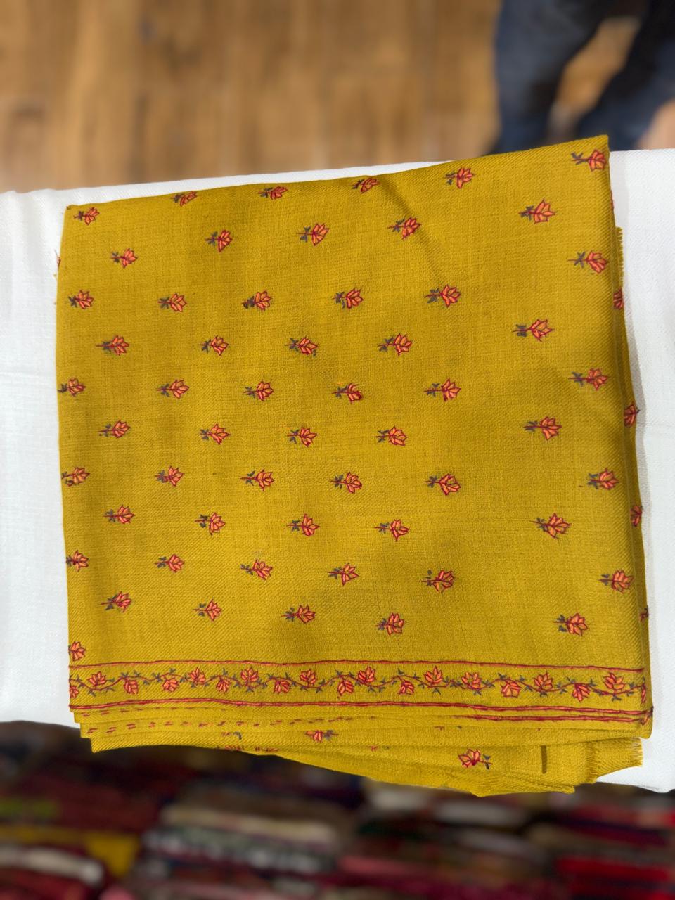 This phrase describes a shawl that strikes a perfect balance between the luxury of the fine pashmina fiber and a restrained, traditional application of Kashmiri hand-embroidery. This style is often chosen for its subtle elegance and lightweight appearance.