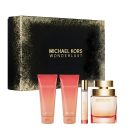 The Michael Kors Wonderlust EDP 100ml + BL 100ml + SG 100ml + EDP TS 10ml Set is a comprehensive fragrance gift set for women, containing the main 100ml Eau de Parfum, a matching 100ml Body Lotion, a 100ml Shower Gel, and a convenient 10ml Travel Spray (TS) for layering and travel, offering an exotic oriental-gourmand scent with notes of almond milk, white flowers, and warm woods for a complete scent experience.