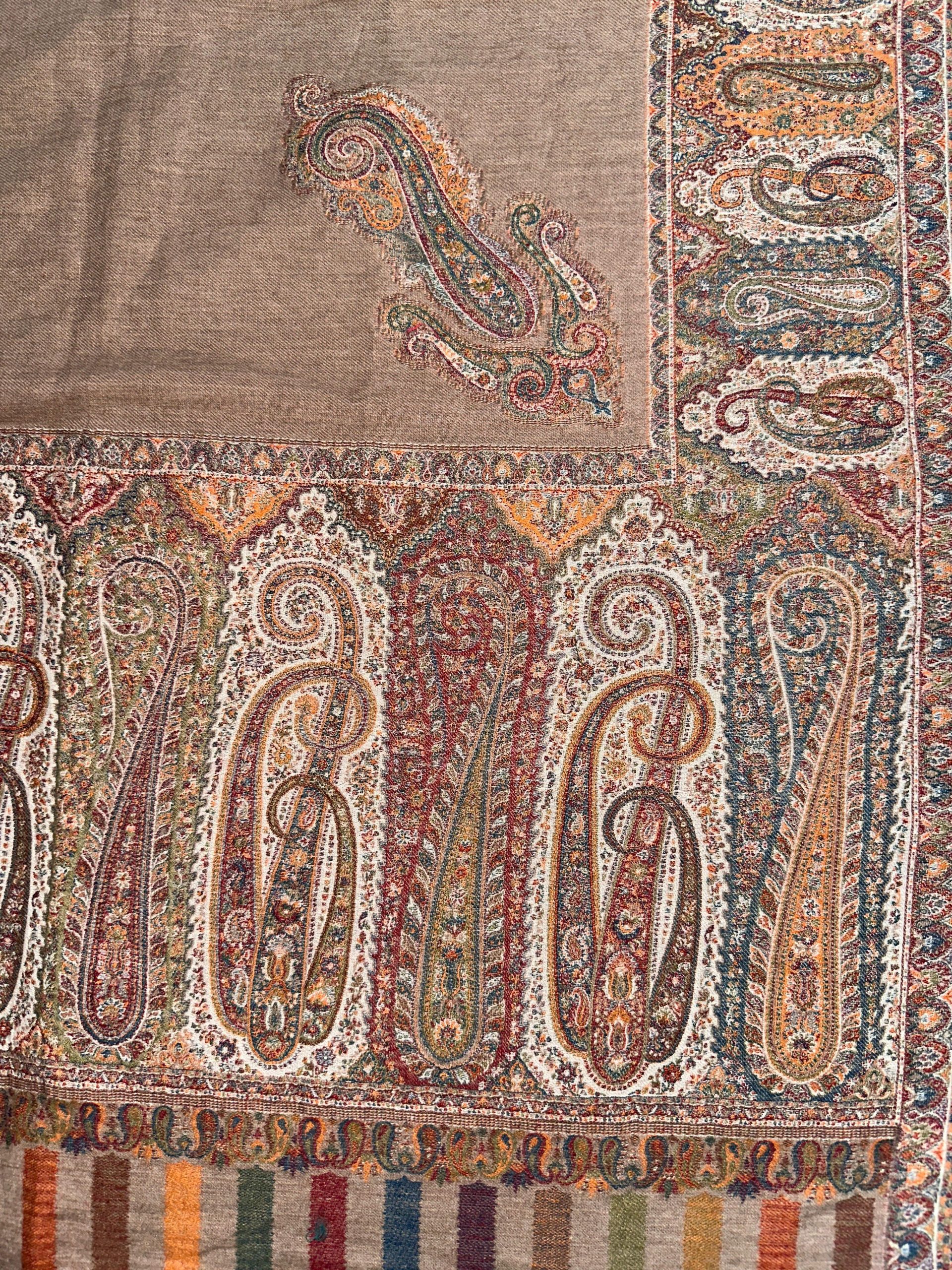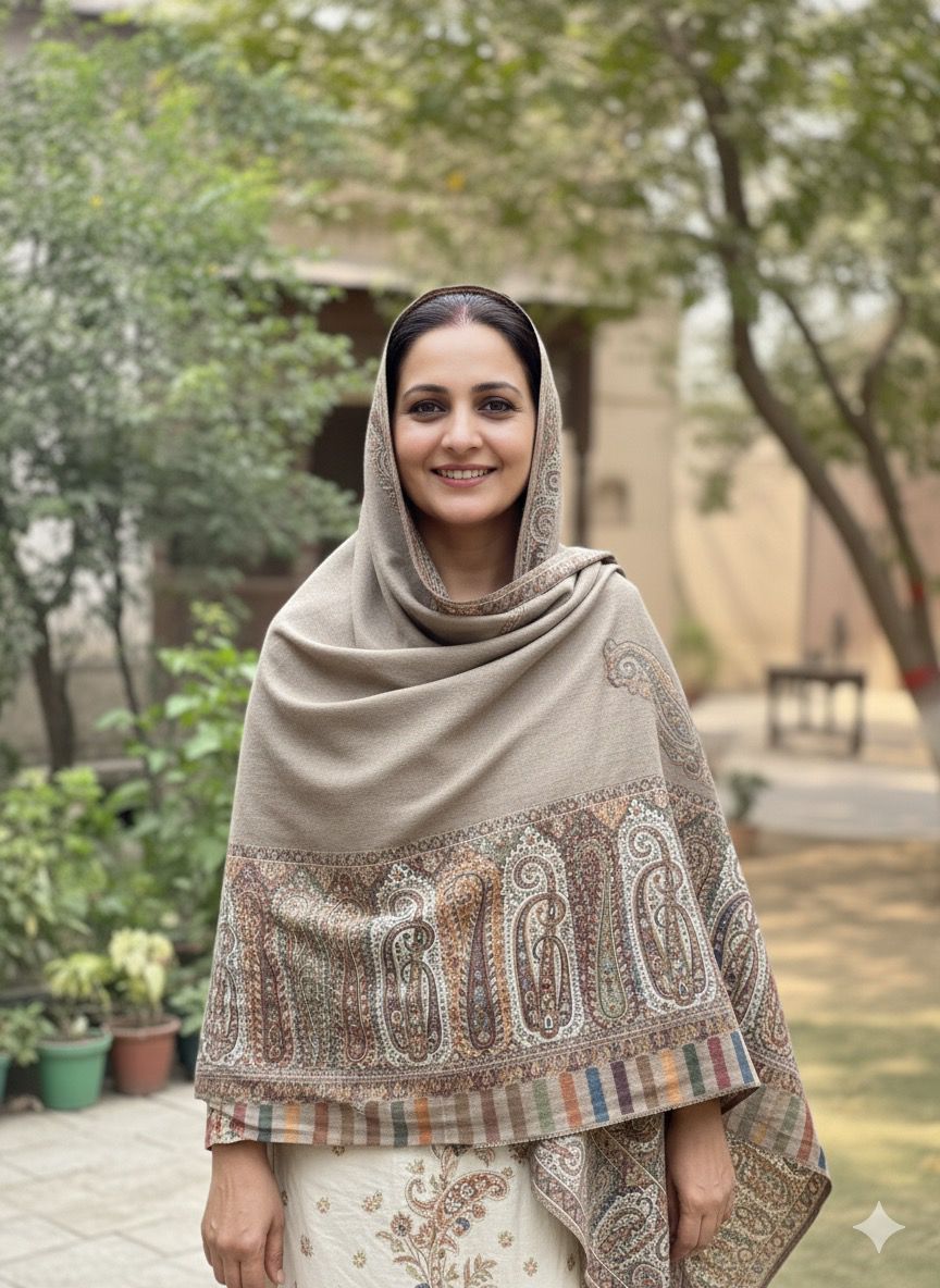 This exquisite shawl is a testament to sophisticated design, pairing the quiet elegance of a neutral base with the vibrant artistry of traditional Kashmiri weaving.