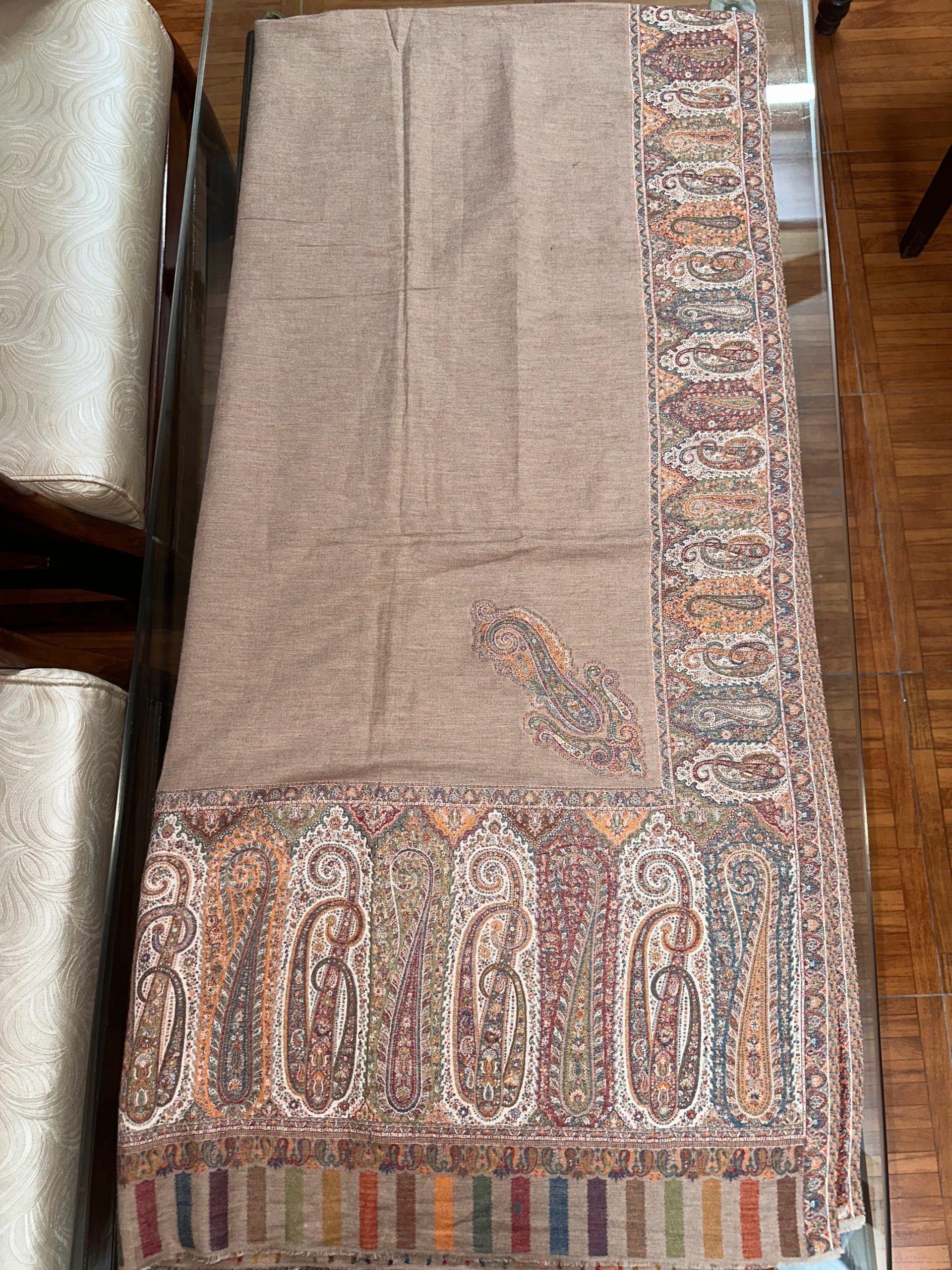 The term multi Kaani work indicates that the artisans have used a wide spectrum of colored threads (such as deep reds, blues, greens, and golds) within the weaving process. Confined to the edges, this vibrant border serves as a rich frame for the subtle beige center. The dense, multi-hued patterns—often stylized florals, paisleys, or geometric motifs—create a striking contrast, transforming the shawl into a balanced masterpiece of quiet luxury and vibrant artisanal detail.
