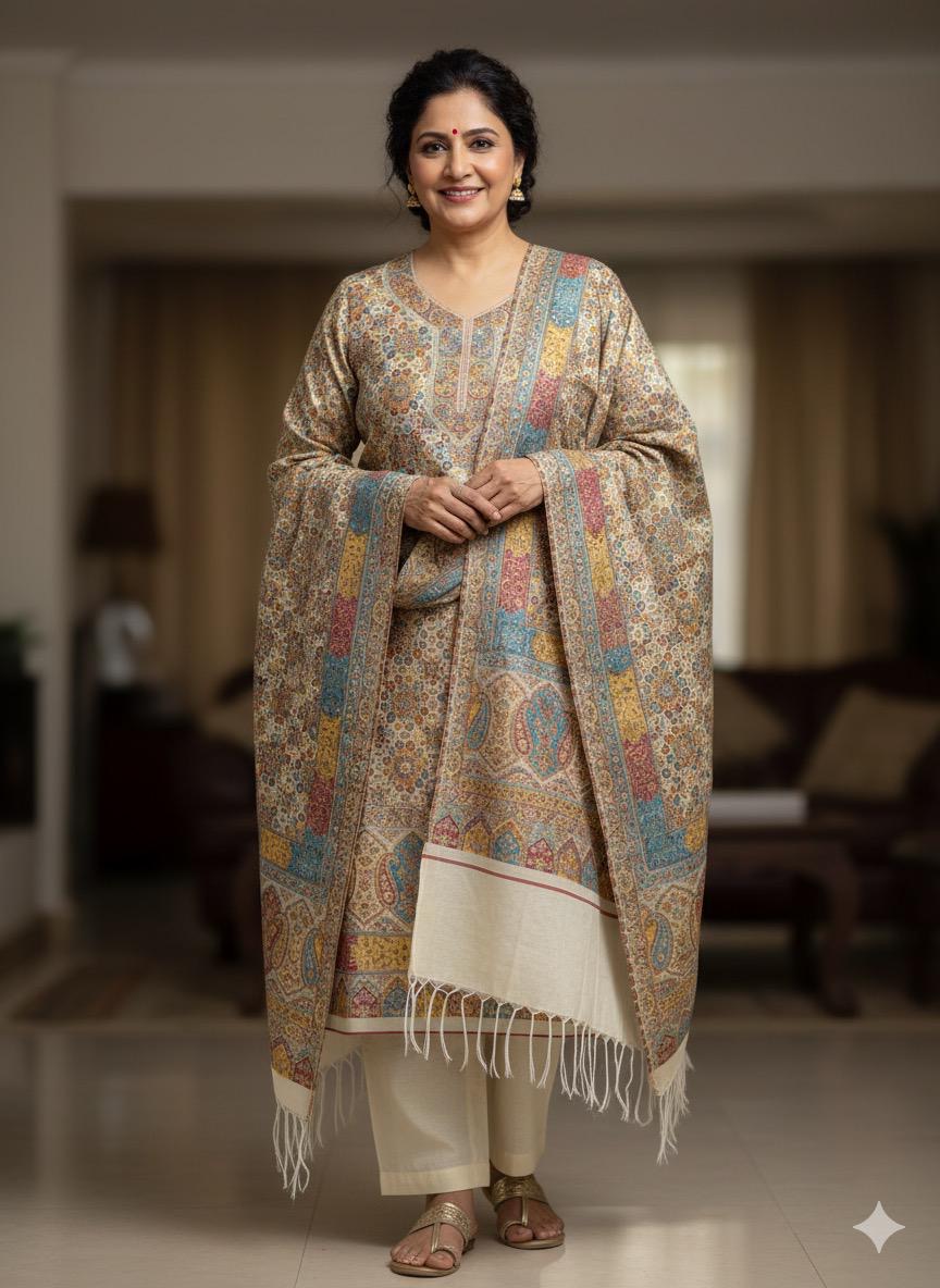 Introducing the New Kani Silk Premium Quality 3 Piece Suit, your ultimate statement of timeless elegance. Sourced from the most exquisite Kani silk, celebrated worldwide for its exceptional quality and luxurious durability, this ensemble is truly captivating. The detailed intricate patterns give the fabric a vibrant depth, ensuring a royal and sophisticated look that turns heads. Make an unforgettable impression at your next wedding, formal event, or grand celebration.